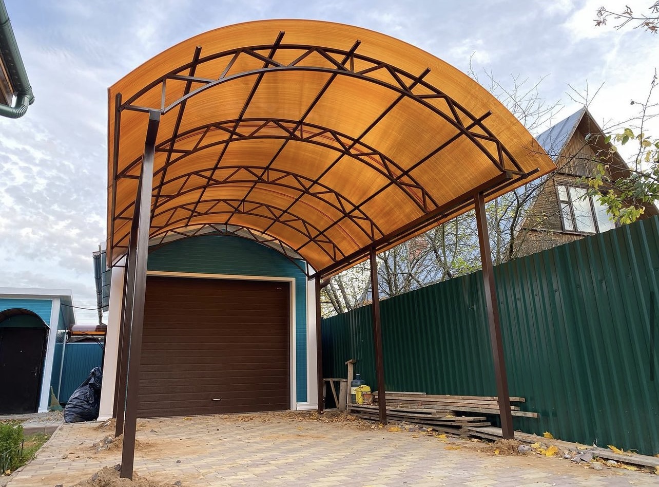 Навес из листов поликарбоната способен стать настоящей «изюминкой» частного дома и приусадебной территории. Полупрозрачные сооружения эстетичны и надежны. Их устанавливают всего за 1-2 дня, за ними легко ухаживать – достаточно чистой воды и неабразивного средства. На первый взгляд кажется, что без такой конструкции вполне можно обойтись. Но стоит купить навес из поликарбоната от компании «Спецкаркас» – и жизнь станет намного проще и комфортнее. Ваше авто больше не будет ржаветь под дождем, крыльцо останется чистым даже в снегопад, на участке появится уютная зона отдыха в кругу друзей и близких.